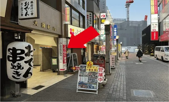 まっすぐ進むと左手に当店の看板が見えます。大昌ビル1階に当店があります。