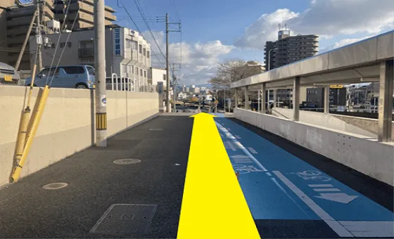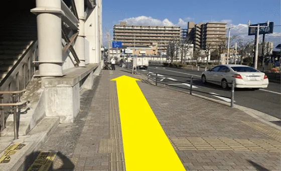 駅を出て左方向に進むと横断歩道がございます。横断歩道を渡っていただき下り坂を下ってください。