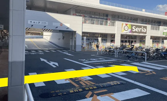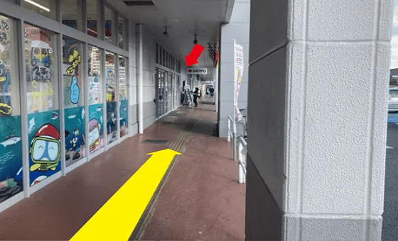 下ると西友がありますので、セリアやドン・キホーテの入口を通り過ぎて西友の入口まで進んでください。